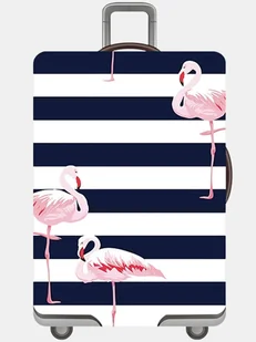 Pokrowiec na walizkę S granatowy S POKROWIEC OCHRONNE ETUI na BAGAŻ WALIZKĘ PODRÓŻNĄ z NADRUKIEM NA ZAMEK S ?? Biało-granatowy szyk i egzotyczne akcenty – podróżuj ze stylem! ✨? Praktyczny pokrowiec wykonany z lekkiego, bardzo elastycznego, ale wytrzymałego materiału, który idealnie dopasowuje się do walizki, zapewniając jej ochronę i wyjątkowy wygląd. Posiada praktyczne zapięcie na zamek błyskawiczny w dolnej części, co umożliwia szybkie i bezproblemowe zakładanie oraz ściąganie pokrowca. Dodatkowo, w dolnej części znajduje się elastyczny pas zapinany na klamrę, który dodatkowo zabezpiecza walizkę, zapewniając jej stabilność i ochronę. Posiada także wygodny otwór na rączkę teleskopową, co sprawia, że przenoszenie walizki staje się łatwe i komfortowe. ? Elegancki wzór łączy marynarskie biało-granatowe pasy ?z delikatnymi różowymi flamingami?, dodając walizce stylu i oryginalności.