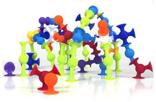 Silikonowe Przyssawki, to niezwykłe klocki, które można łączyć ze sobą oraz z gładkąÂ powierzchnią. Przyssawki są giętkie, zasysają się i łapią się wszystkiego. Wystarczy, że dziecko użyje swojej wyobraźni, aby w jego pokoju zabawnie dyndały przyssane do wszystkiego kolorowe klocki, które będą mu dawać dużo radości. Zabawa jest świetna nie tylko przy łączeniu przyssawek, ale również przy ich rozłączaniu, kiedy to klocki śmiesznie "strzelają". Przyssawki przyklejają się do siebie i do każdej głakiej powierzchni. To nowy gatunek klocków.Wyginają się, przyklejają i dyndają. Klocki są bezpieczne dla wszelkich powierzchni, mogą być przyklejane do wanny, okna, ściany, komputera i nie pozostawiają żadnych śladów. Klocki te rewelacyjnie rozwijają motorykę rąk dziecka. Wykonane są z wysokiej jakości silikonowej gumy. Przyssawki Squigz Zestaw Startowy to 50 silikonowych klocków w 8 różnych niesamowitych kształtach.