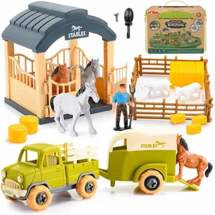 MTOYS Nazwa handlowa: ZESTAW KONSTRUKCYJNY STADNINA KONI DO ROZKRĘCANIA GOSPODARSTWO STAJNIA Zawartość zestawu: zielona ciężarówka FARM, przyczepa na konie z otwieraną rampą, stajnia STABLES, elementy ogrodzenia/ zagrody, bele „siana”, figurki zwierząt (konie, owce), figurka rolnika, śrubokręt oraz śruby do montażu wybranych elementów Funkcje: możliwość skręcania/rozkręcania, transport zwierząt, odgrywanie ról na farmie Materiał: wysokiej jakości tworzywo sztuczne (ABS i pokrewne) o zwiększonej wytrzymałości Wiek: