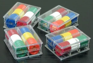 Plastikowe żetony z nominałami do gry w ruletkę. Zawartość: 240 żetonów Cechy gry: liczba graczy: 2+ średnica żetonów: 25 mm