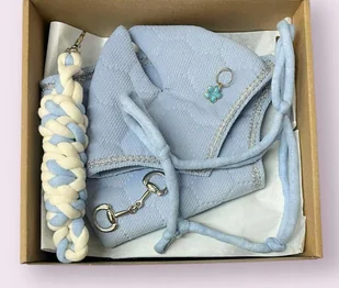 Derka: długość: ok. 26 cm szerokość: ok. 42 cm Nauszniki: długość: ok. 12 cm szerokość: ok. 17 cm HALTER Halter wykonany z błękitnego sznurka. Dedykowany dla Hobby Horse w rozmiarze A4.