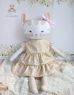 Przeurocza przytulanka, Kicia z beżowymi łatkami, uszyta ręcznie z najwyższą starannością, ubrana w beżową sukieneczkę w drobne kwiatuszki, z falbankami. Wykonana ze 100% bawełny, wypełniona antyalergic ...
