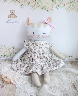 Przeurocza przytulanka, Kicia z beżowymi łatkami, uszyta ręcznie z najwyższą starannością, ubrana w beżową sukieneczkę z falbankami, w drobne bordowe kwiatuszki. Wykonana ze 100% bawełny, wypełniona antyalergic ...