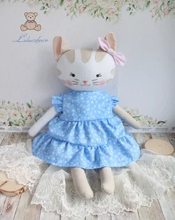 Przeurocza przytulanka, Kicia z beżowymi łatkami, uszyta ręcznie z najwyższą starannością, ubrana w niebieską sukieneczkę w drobne kwiatuszki, z falbankami. Wykonana ze 100% bawełny, wypełniona antyalergi ...