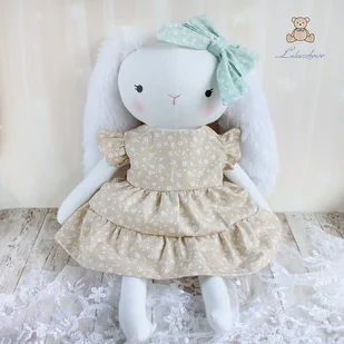Przeurocza przytulanka, króliczek a właściwie królisia cała w bieli, uszyta ręcznie z najwyższą starannością, ubrana w beżową sukieneczkę w białe drobne kwiatuszki. Wykonana ze 100% bawełny, wypełniona ant ...