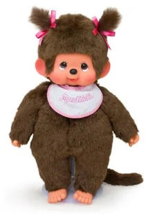 Sekiguchi 255530 - Oryginalny pluszak Monchhichi Girl ze śliniakiem biało-różowym i warkoczami z kokardkami, ok. 45 cm, brązowa