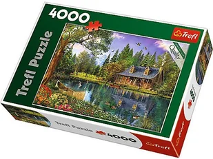 Puzzle 4000 elementów z obrazem przedstawiającym dom nad stawem. Po ułożeniu powstanie obrazek o wymiarach 136 x 96 cm. Wysoką jakość, nasycenie kolorów i bezpieczeństwo układania zapewnia kalandrowany papier odbijający światło, pokryty ekologicznymi farbami spożywczymi.