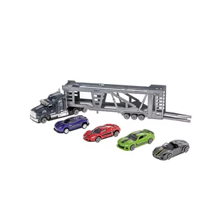 Transporter pojazdów wyścigowych z akcesorami ELEFUN spodoba się każdemu dziecku lubiącemu bawić się samochodami, innymi pojazdami i odtwarzać różne sytuacje na drodze. Oprócz lawety i samochodów w zestawie znajdują się także elementy oznaczeń drogowych. Zestaw zawiera lawetę, 4 samochody sportowe i elementy oznaczeń drogowych.
