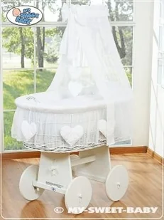 Piękny ręcznie pleciony wiklinowy kosz z oryginalnym dużym drewnianym podwoziem. Biały kolor wikliny i drewna. Wiklinowy kosz do spania dla niemowląt renowmowanej firmy MY SWEET BABY, wiodącego europejskiego producenta takich koszy. Najwyższa jakość, tkaniny z certyfikatem Okotex i TUV. Świetne rozwiązanie zarówno do małych mieszkań, jak i domów.