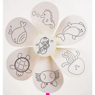 Wiatraczek Tinting do kolorowania morze. Kolorowanka. papierowy wiatraczek z szablonem do malowania, 6 końcówek, centralne koło, patyczek, całkowita długość złożonego wiatraczka 38,5 cm