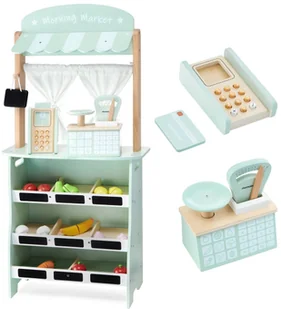 Nie zapomnijcie także, aby na specjalnej tabliczce wypisać dzisiejsze promocje!Z drugiej strony znajdziecie teatr z kurtyną. Mały aktor może w nim wystawiać nieskończoną ilość przedstawień. Teatr został wyposażony w urocze zasłonki oraz dużą tablicę kredową do zapowiadania kolejnych przedstawień. Owacjom i bisom nie będzie końca!Główne cechy: Piękna stylistyka i pastelowe kolory pasujące do każdego wnętrzaStabilna, drewniana konstrukcjaZabawka 2w1 - stoisko sklepowe lub teatrRuchoma wagaTerminal z kartą płatnicząAż 16 sztuk warzyw i owoców do krojenia (każde warzywo lub owoc składa się z dwóch połówek połączonych rzepem)8 przegródek do segregacji sprzedawanych produktówLiczne tabliczki do opisywania cen produktówDuża tablica kredowa do zapowiadania przedstawieńUrocza zasłonka sklepowa lub kurtyna teatralnaBezpieczne, zaokrąglone narożnikiNajwyższa jakość - zabawka wykonana z dużą dbałością o każdy detalProdukt został przebadany pod kątem zgodności z normami europejskimi, posiada Certyfikat CE oraz testy EN71W zestawie:
