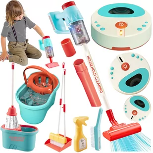 DUŻY INTERAKTYWNY ZESTAW DO SPRZĄTANIA DLA DZIECI - 14 ELEMENTÓW ⏩ PŁASKI ROBOT SPRZĄTAJĄCY - ZBIERA OKRUSZKI ⏩ ODKURZACZ PIONOWY Z BAZĄ - ZBIERA OKRUSZKI ⏩ WIADRO Z MOPEM NA KIJU ⏩ SZUFLA I MIOTŁA NA KIJU ⏩ MAŁA MIOTEŁKA ⏩ MAŁA KOŃCÓWKA DO ODKURZACZA ⏩ PŁASKA KOŃCÓWKA DO ODKURZACZA