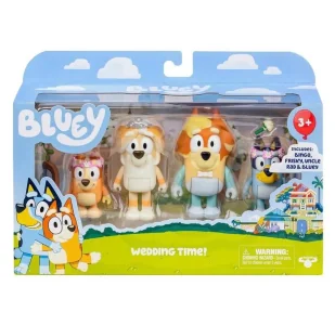 Wujek Rad jest gotowy zawiązać węzeł z frisky!Bluey i Bingo dołączają do świętowania jako dziewczyny z kwiatami!1 bluey z koroną kwiatową1 bingo z koroną kwiatową1 rad z muszką1 frisky1 welon ślubny EAN: 0630996175903