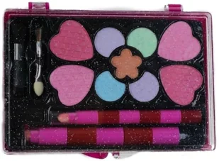 Czarno-różowa paletka do makijażu dla dzieci. Zestaw zawiera cienie do powiek, róż do policzków dwie pomadki w kredce, aplikator i pędzelek. Zestaw pochodzi z serii zabawek Princess Coralie i stworzony przez niemiecką firmę Klein.
