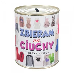 Skarbonka metalowa z napisem 'Zbieram na ciuchy i dobry nastrój'. Rozmiar 12x10 cm