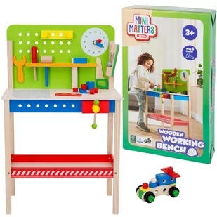 Drewniany warsztat dla dzieci Mini Matters to idealny sposób na rozwijanie kreatywności i umiejętności manualnych u dzieci już od 3 roku życia. Ten drewniany warsztat to nie tylko zabawka, ale także narzędzie do nauki i zabawy. Zestaw zawiera aż 40 drewnianych elementów, w tym stół warsztatowy oraz 6 narzędzi, takich jak młotek, śrubokręt, a nawet poziomica i inne, które pozwalają dzieciom tworzyć i konstruować. Elementy zestawu, takie jak deseczki, klocki, kółka, śruby i nakrętki, pozwalają na kreatywne budowanie różnych struktur i projektów. Dziecko może z tych elementów zbudować samochód za pomocą śrub i narzędzi z zestawu.