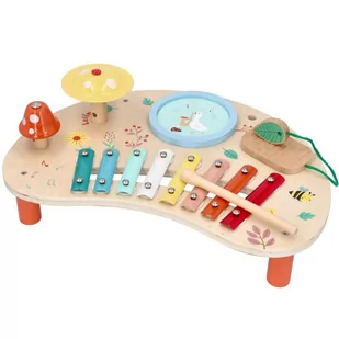 Stolik muzyczny dla dzieci Jest to wspaniały prezent dla jeśli masz w domu małego melomana który uwielbia odkrywać nowe dźwięki i świetnie się przy tym bawić, stolik będzie stanowił idealny prezent który dzięki solidnej drewnianej konstrukcji osadzonej na 4 nóżkach będzie zapewniał zabawę Twojemu maluszkowi przez długie lata. Marka: LELIN Symbol: L21032 Wiek: 1+ Co możemy znaleźć na muzycznym stoliku Na stoliku znajdziemy pięć głównych elementów: Ośmiotonowe cymbałki Bębenek (z wizerunkiem gęsi) Metalowego czerwonego grzybka Metalowy żółty talerzyk Gueiro (instrument perkusyjny używany w muzyce latynoamerykańskiej) Wymiary Wysokość: