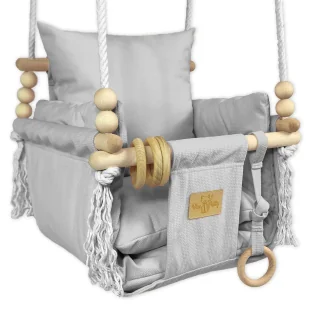 Radość, zabawa i bezpieczeństwo w jednym Idealna do zawieszenia w domu, na tarasie lub w ogrodzie Wyposażona w dwie miękkie poduszki prostokątne i jedną podłużną dla większego komfortu Dodatkowe drewniane elementy – gryzaki i kuleczki – wspierają rozwój sensoryczny dziecka Regulowane bawełniane liny pozwalają dostosować wysokość huśtawki Dedykowana dzieciom od 6. miesiąca życia, maksymalne obciążenie: 20 kg Solidne mocowanie za pomocą dwóch metalowych obręczy Naturalne materiały – gwarancja jakości i komfortu Konstrukcja wykonana z naturalnego drewna o gęstości do 550 kg/m³ i wysokiej wytrzymałości na zginanie do 100 MPa. Poduszki wykonane z miękkiej, gęstej i aksamitnej tkaniny obiciowej typu velvet posiadającej bardzo dobrą odporność na ścieranie (do 100 000 cykli - test Martindale). Wypełnienie z oddychającej kulki silikonowej – hipoalergiczne, nieodkształcające się, zapewniające długotrwały komfort Bawełniane liny o dużej wytrzymałości, odporne na przetarcia i łatwe do regulacji Wszystkie wykorzystane materiały posiadają certyfikaty OEKOTEX 100 klasa I oraz CE, co potwierdza ich pełne bezpieczeństwo dla dzieci Wymiary: