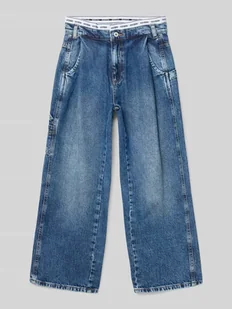 Dziecięce jeansy od Guess;Czysta bawełna;Prosty krój;Wyhaftowane logo;Aplikacja z logo;Wpuszczane kieszenie i kieszenie z tyłu;Zapięcie na guzik i zamek błyskawiczny;Szerokość w pasie przy rozmiarze 140: 35 cm;Długość wewnętrzna nogawki przy rozmiarze 140: 64 cm