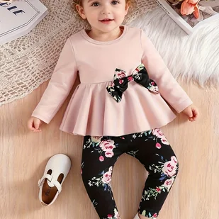 TEMU Zestaw 2 szt.: Bluzka + Spodnie, Kolekcja Wiosna/Jesień, Różowa Bluzka z Długim Rękawem i Wachlarzowym Dołem dla Dziewczynek, Czarne Legginsy z