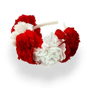 OPASKA DO WŁOSÓW BARWY NARODOWE - BIAŁO CZERWONE KWIATY NA BIAŁEJ OPASCE O SZEROKOŚCI 1 CM KWIATY Z TWORZYWA SZTUCZNEGO - GOŻDZIKI - ŁODYGA WKRĘCONA DO OPASKI - DODATKOWO KLEJONA WAGA OPASKI: 29g