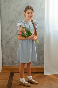 Elegancka sukienka z uroczymi rękawkami z pięknym haftem angielskim. Uszyta z bawełny plumeti w pięknym niebieskim kolorze. Z tyłu wiązana na pasek. Idealna na wyjątkowe uroczystości. Idealnym dopełni ...