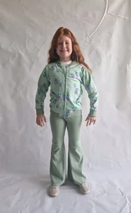 Bluza bomberka w kolorze zielonym we fioletowe kwiatuszki, uszyta z dzianiny dresowej pentelki. Bomberka wykończona ściągaczem przy dekolcie, rękawach i na dole, zapinana na plastikowe napy. Bluzę możn ...