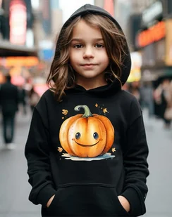 Bluza dziecięca z dynią - dziewczynka/chłopiec Bluza dziecięca dla dziewczynki/chłopca - unisex z kapturem i kieszenią kangurkową Bardzo miła w dotyku. Sznurki w kolorze bluzy. Naszyta kieszeń-kangurka. Elastyczne ściągacze 1¡2x1 u dołu rękawów i bluzy. 290 g/m² - GRAMATURA 65% poliestru / 35% Bawełny Rozmiarówka - wiek oraz wymiary: