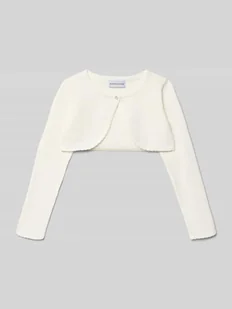Bolerko dziecięce DANAMADE;Mieszanka bawełny;Prosty krój;Okrągły dekolt;Zapięcie na guzik z ozdobnym kamieniem;Design z długim rękawem;Bordiura z ażurowym wzorem;Długość tyłu w rozmiarze 134: 23 cm;Długość rękawa w rozmiarze 134: 48 cm