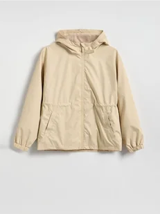 Kurtka o prostym kroju, wykonana z tkaniny o podstawowej wodoodporności.