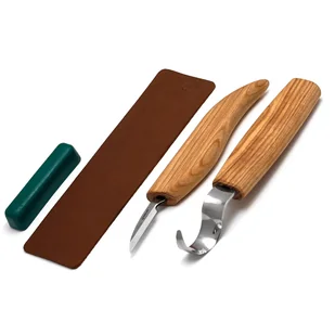 Ten zestaw narzędzi jest idealny do rzeźbienia łyżek. Dzięki temu zestawowi możesz wycinać łyżki małych i średnich rozmiarów, używając zarówno miękkiego, jak i twardego drewna. Zestaw zawiera nóż do wycinania łyżek (nóż hakowy lub nóż do łyżek) o średnicy 25 mm oraz nóż do kształtowania łyżki - delikatny nóż do rzeźbienia lub nóż do rzeźbienia wiórowego. Dzięki temu zestawowi możesz nie tylko wycinać łyżki, ale także pomóc w rzeźbieniu małej miski, kuksy i wielu innych. Tekstura rękojeści może się różnić, ponieważ rękojeści wykonane są z naturalnego drewna.