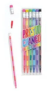 Cudownie kolorowe kredki z przekładanym wkładem w plastikowej oprawie, z gumką do ścierania w odcieniu kredki. Zestaw zawiera 6 kredek, 12 różnych kolorów, i 6 kolorowych gumeczek do ścierania na końcu kredki. Kredek nie trzeba temperować, wystarczy zmienić wkład. Wkłady można mieszać między kredkami i tworzyć swoje własne kompozycje kolorów w kredce.