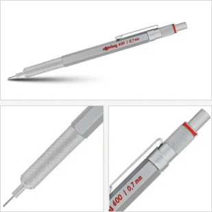 Ołówek automatyczny rOtring 600 0.7 mm ze srebrnym korpusem to ikoniczne narzędzie stworzone do długotrwałego użytkowania. Metalowy korpus jest doskonale wyważony, by pisać i rysować bez zmęczenia. Mosiężny mechanizm zapewnia precyzję przy wysuwaniu rysika, a dostosowywany wskaźnik twardości pozwala na łatwą identyfikację podczas pracy. Jego sześciokątny kształt zapobiega staczaniu się ze stołu lub deski. Mocowana na stałe tuleja zapobiega łamaniu rysika i zapewnia łatwy dostęp do strony przy precyzyjnym kreśleniu z linijką. Doskonałe do częstego pisania, rysowania i szkicowania.