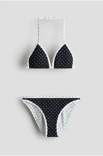 Kostium bikini w całości z podszewką składający się z góry i majtek. Trójkątny top z wyjmowanymi wkładkami i regulowanym mocowaniem na karku. Z tyłu plastikowe zapięcie.