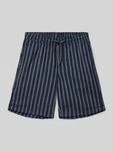 Bermudy dziecięce JACK & JONES;Mieszanka materiałów z dodatkiem bawełny;Krój regular fit;Model ‘JAIDEN’;Elastyczny pas z tunelem;Wzór w paski;Szerokość w pasie w rozmiarze 140: 34 cm;Długość wewnętrzna nogawki w rozmiarze 140: 17 cm