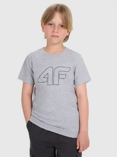 Koszulka dla chłopaka - CECHY: gramatura 180 gsm – lekka i przewiewna struktura materiału idealna na cieplejsze dni zakres rozmiarów 122-164 – dostosowany do potrzeb młodszych użytkowników krój regular – standardowe dopasowanie zapewniające komfort noszenia standardowy fason do bioder – uniwersalna długość odpowiednia na co dzień wykonana w 90% z bawełny – gwarancja miękkości, trwałości i komfortu jednolita kolorystyka – łatwe dopasowanie do różnych stylizacji dzianina single jersey – gładka i przyjemna w dotyku powierzchnia okrągły dekolt z lekkim ribowaniem – klasyczne wykończenie zwiększające trwałość kształtu nadruk "4F" z przodu - akcent podkreślający sportowy charakter marki T-shirt z nadrukiem chłopięcy idealnie sprawdzi się jako element zarówno casualowych, jak i sportowych stylizacji na co dzień. Posiada regularny krój, który wygodnie dopasowuje się do sylwetki nie krępuje ruchów w trakcie aktywności oraz standardową długość sięgającą do linii bioder. Splot single jersey z jednostronną gładką powierzchnią sprawia, że koszulka jest elastyczna i komfortowa w noszeniu. Koszulka z krótkim rękawem chłopięca dzięki gramaturze 180 gsm jest miękka w dotyku i dobrze się układa.