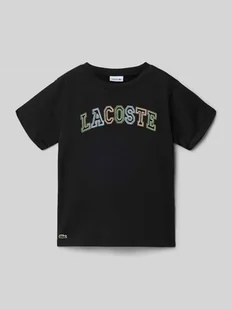 dziecięcy t-shirt od Lacoste;efekt: jednolity kolor;Dopasowanie: krój regular fit;Aplikacja: wyhaftowane logo, aplikacja z logo;dekolt: okrągły dekolt;rękaw: krótki rękaw;Wykończenie materiału: dżersej;Materiał: czysta bawełna