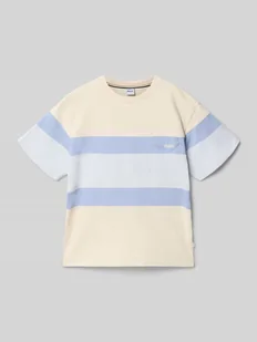 Koszulka dziecięca od BOSS;efekt: wielokolorowy;Dopasowanie: krój regular fit;Aplikacja: z napisem z logo;dekolt: okrągły dekolt;Rękaw: krótki rękaw;Wykończenie materiału: pika;Materiał: mieszanka bawełny