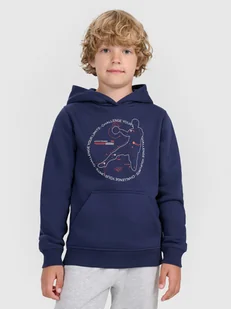 Bluza z kapturem 4F chłopięca - CECHY: gramatura 320 gsm – lekki materiał zapewniający komfort noszenia przez cały dzień zakres rozmiarów 122–164 – dopasowanie do sylwetek dzieci i młodzieży jednostronnie czesane wnętrze – dodatkowa warstwa ocieplająca od wewnątrz krój regular – wygodne dopasowanie gwarantujące swobodę ruchów standardowy fason sięgający do bioder – uniwersalne rozwiązanie na co dzień 80% bawełny – miękka, trwała i przyjemna w dotyku tkanina 20% poliestru – zwiększona odporność na zużycie i deformacje jednolita kolorystyka – łatwa do zestawienia z różnymi stylizacjami dzianina single jersey – miękka i gładka powierzchnia zapewniająca komfort noszenia kaptur zintegrowany z dekoltem – dodatkowa ochrona w chłodniejsze dni mankiety i dół ze ściągaczem – lepsze dopasowanie i utrzymanie ciepła nadruk z przodu z piłkarskim motywem – efektowny detal podkreślający sportowy charakter kieszeń typu kangurka – praktyczne miejsce na drobiazgi i ogrzanie rąk wkładana przez głowę – szybkie i wygodne zakładanie obniżona linia ramion – swobodniejszy krój i modny wygląd Jak prać odzież i obuwie sportowe? Bluza dresowa chłopięca nierozpinana z kapturem idealnie sprawdzi się jako element zarówno casualowych, jak i sportowych stylizacji na co dzień. Posiada krój regular, który wygodnie dopasowuje się do sylwetki. Splot single jersey z jednostronną gładką powierzchnią sprawia, że jest ona elastyczna i komfortowa w noszeniu. Bluza dresowa chłopięca z kapturem posiada średnią gramaturę 320 gsm, która sprawia, że jest ona miękka oraz bardziej przewiewna.