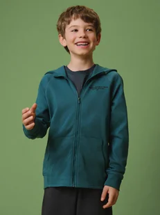 Ta chłopięca bluza dresowa została uszyta z miękkiej dzianiny o gładkiej i sprężystej strukturze, która zapewnia komfort podczas codziennych aktywności. Materiał dobrze układa się na sylwetce i sprawdza się w ruchu. Zintegrowany kaptur stanowi dodatkową osłonę, a dwie otwarte kieszenie z przodu pozwalają ogrzać dłonie lub przechować drobiazgi. Raglanowe rękawy wspierają swobodę ruchów podczas zabawy, a krój regular i długość do bioder gwarantują wygodne dopasowanie.