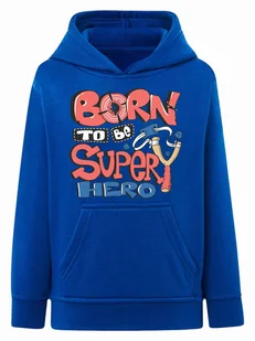 Wyprodukowano w Polsce Bluza chłopięca kangurek z kapturem w kolorze niebieskim, zdobiona napisem "Born to be super hero". Doskonała dla młodych bohaterów gotowych na każdą przygodę, dodająca odwagi i stylu do ich codziennego looku! Skład surowcowy: 60%bawełna 40% poliester