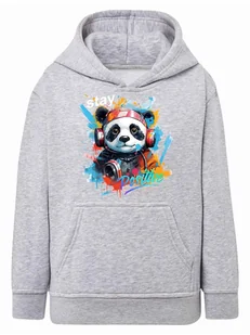 Wyprodukowano w Polsce Bluza chłopięca z kapturem w kolorze szarym z uroczym motywem pandy. Wyposażona w praktyczną kieszeń typu kangurka, która zapewnia miejsce na przechowywanie drobiazgów czy ogrzewanie dłoni w chłodniejsze dni. Idealna na każdą okazję, zapewniając nie tylko modny wygląd, ale także wygodę noszenia i funkcjonalność. Skład surowcowy: 60%bawełna 40% poliester