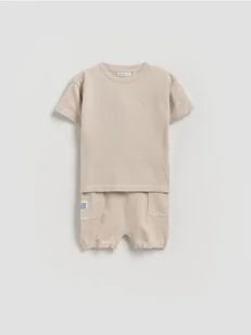 Komplet składający się ze swetra i szortów, wykonany z dzianiny z wiskozą.