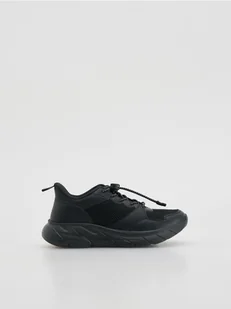 Buty o prostym fasonie, wykonane z łączonych materiałów.