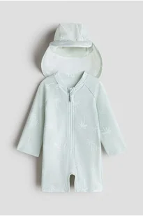 Komplet przeciwsłoneczny w nadruki wykonany z materiału z filtrem UV składający się z kostiumu kąpielowego i czapki z daszkiem. UPF 50. Kostium kąpielowy ma małą stójkę, długie reglanowe rękawy, krótkie nogawki i zapięcie na suwak z osłoną przed otarciem. Czapka z daszkiem i osłoną karku.