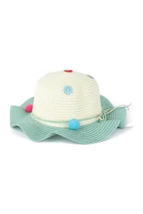 Letni kapelusz dla dziewczynki, z falowanym rondem. Dodatkowo ozdobiony kolorowymi kwiatuszkami i pomponikami. Kapelusz na lato, bardzo wygodny, wykonany z naturalnych materiałów. Będzie idealnie pasować do zwiewnych letnich sukienek. Kolory pomponików i kwiatuszków są losowe i mogą się różnić od tych widocznych na zdjęciach.
