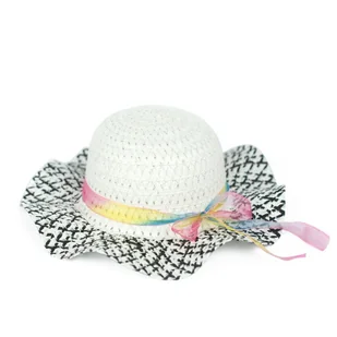 Słodki letni kapelusz dla dziewczynki, z fantazyjnym rondem.Dodatkowo ozdobiony tęczową wstążką.Wykonany z naturalnych materiałów, bardzo lekki.Będzie idealnie pasować do zwiewnych letnich sukienek.