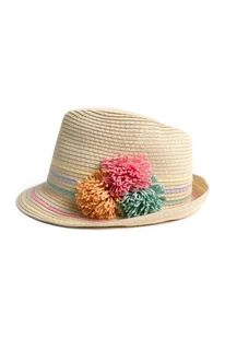 Kapelusz na lato dla dziecka o fasonie trilby. Wykonany z impregnowanego papieru, dzięki czemu jest bardzo lekki i przewiewny. Ozdobiony kolorowymi, papierowymi "pomponami" i kolorowymi paskami dookoła główki. Będzie świetnym dopełnieniem wszystkich dziecięcych, letnich stylizacji. Sprawdzi się również jako ochrona głowy podczas wakacyjnego plażowania.