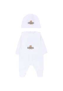 Set tutine bianco del brand Moschino Kids, composto da tutina, bavaglino e cappello. Tutina in cotone garzato, a maniche lunghe, con girocollo, bottoni automatici sul retro, polsini a costine e piedini; cappello con risvolto; bavaglino con bottone automatico laterale. È decorato con stampa Teddy Bear e logo, sulla parte anteriore.