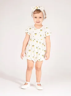 Doskonały w ciepłe dni, rampers, posiada krótkie rękawki i nogawki. Wykonany z 100% drukowanej kremowej bawełny. Druk przedstawia cytrynki. Produkt zdobią ma...